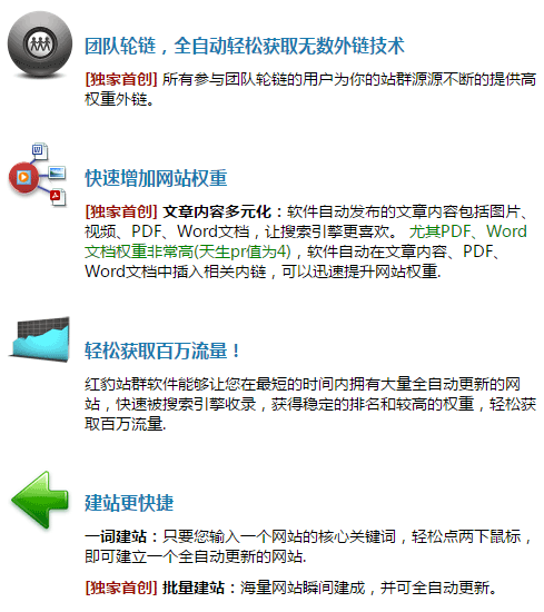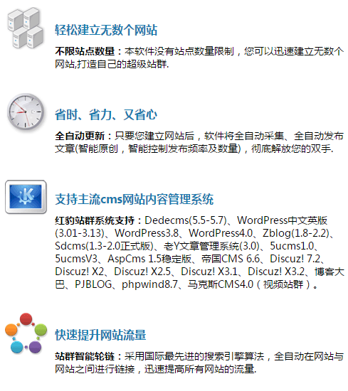 自从用了红豹站群软件1个月之后,我的小说站从5000ip涨到了25000多ip,足足涨了5倍多哦,让我惊呆了,作为一个8年做站经验的站长,在这么短的时间内,能达到这么好的效果,非红豹站群莫属。 |